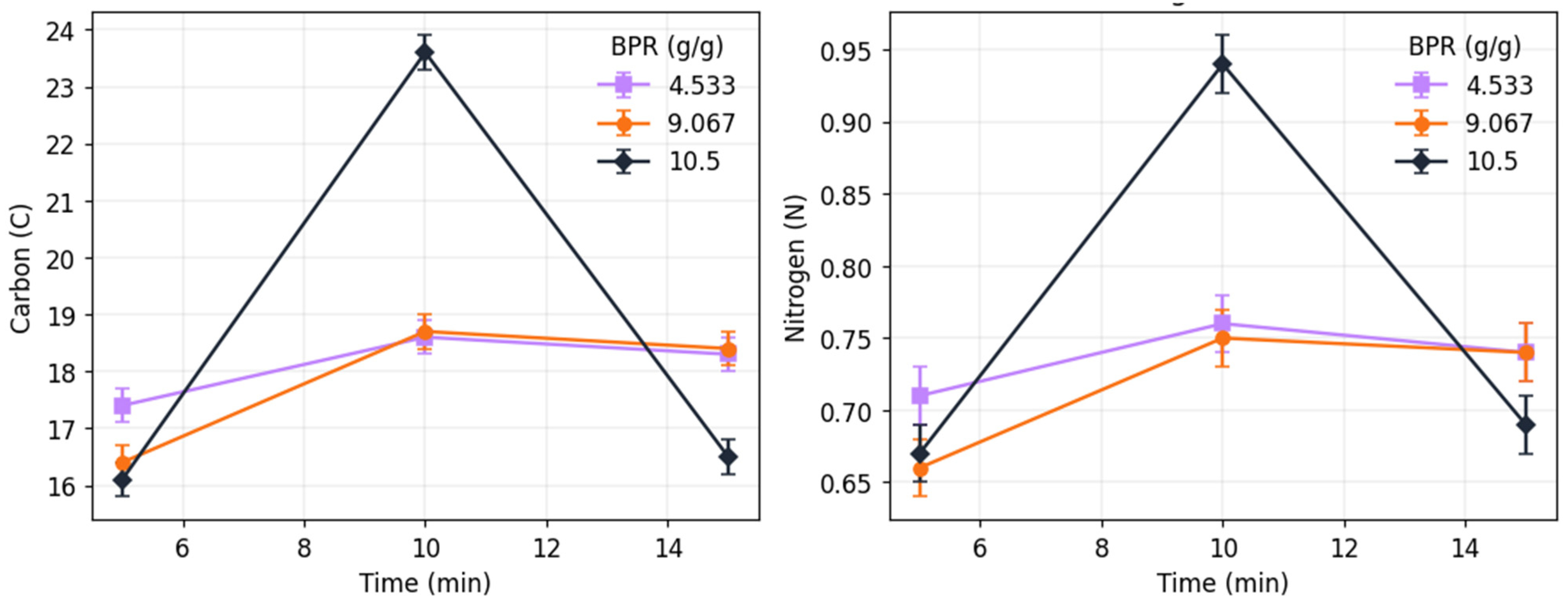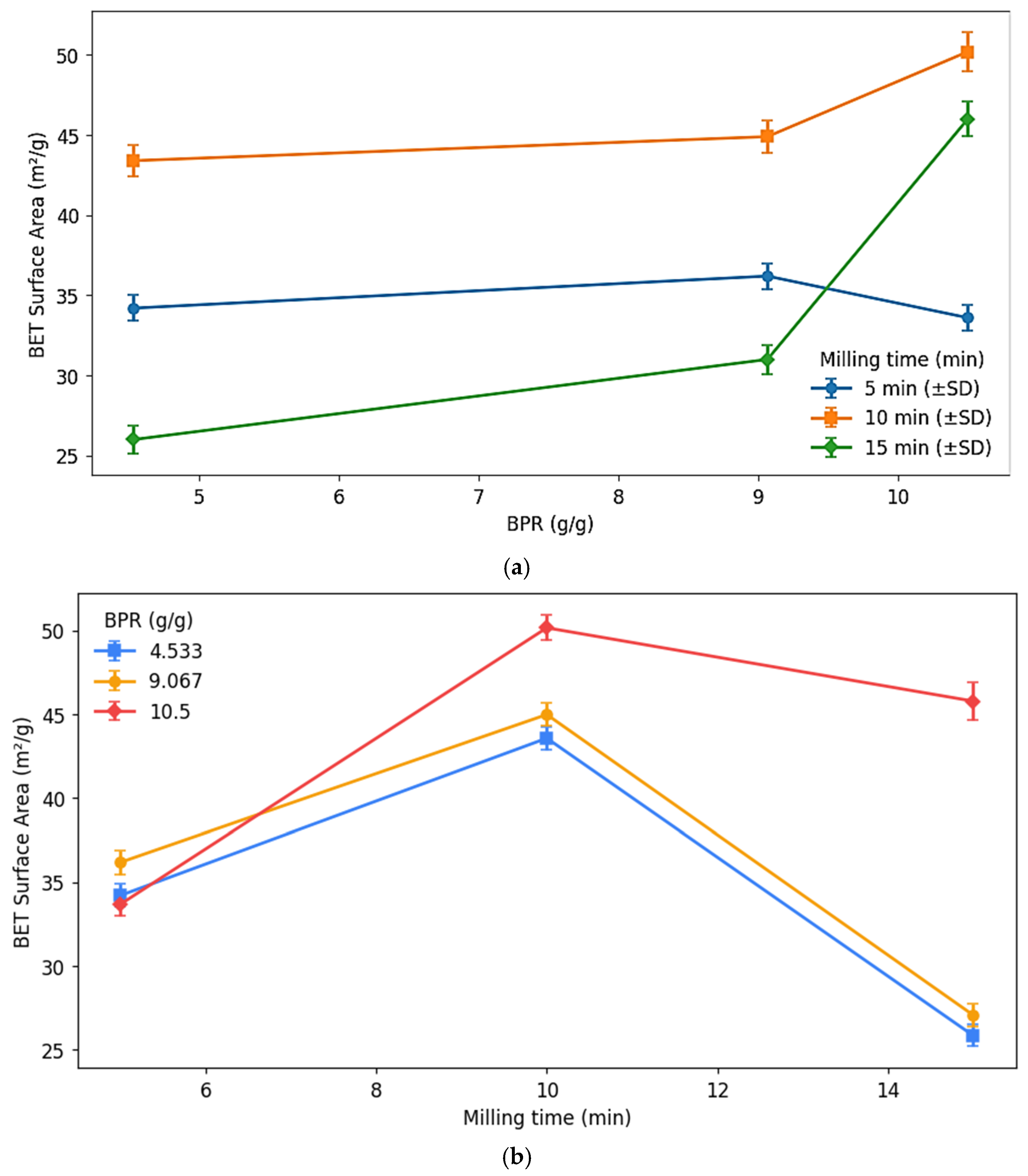 4.1. Effect of BPR and Milling Time on Carbon and Nitrogen