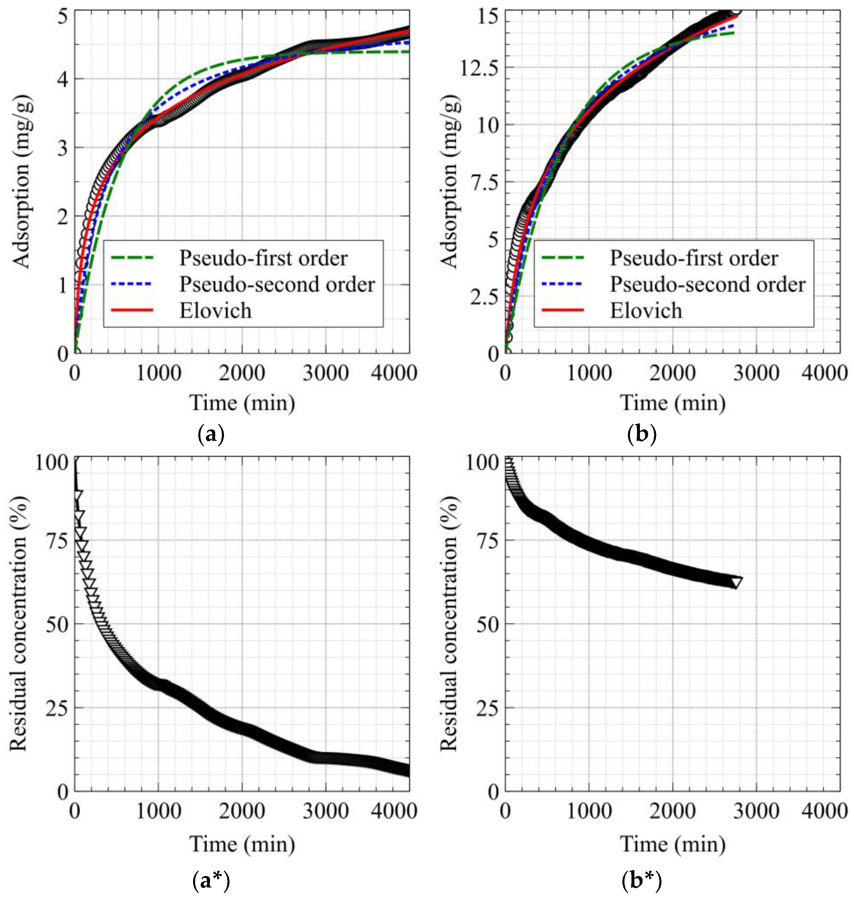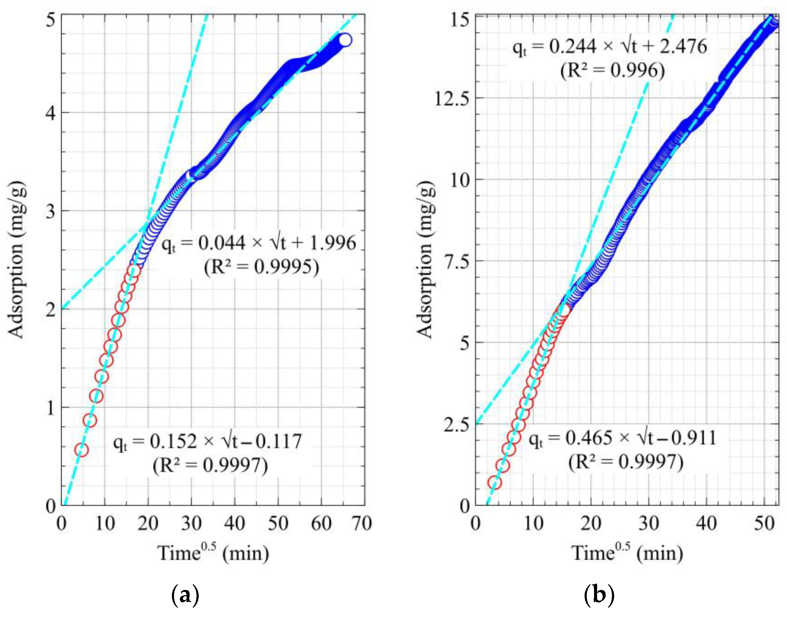 | Elovich | a | 0.038 ± 0.001 | 0.046 ± 0.001 |