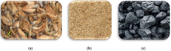 Coconut husk and rice husk, for example, are abundant agro-industrial by-products that have attracted interest as alternative fuels. However, challenges such as irregular availability, bulk volume and costly logistics hinder their practical application, particularly in areas where production is decentralised or seasonal [,,]. Coconut husk and rice husk were selected as representative biomasses due to their abundant production in local agricultural and industrial activities, ensuring regional relevance. Other potential sources of biomass, such as forest residues, were not considered due to their limited availability in the study area.