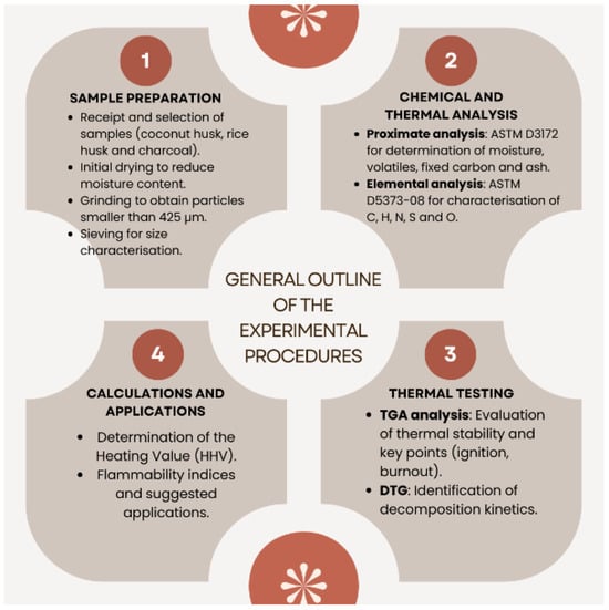 This study considered three fuel samples: coconut husk, rice husk, and mineral coal, all sourced from the same geographical region to minimize variability due to origin. The biomasses were collected from agricultural processing facilities and the coal from a local supplier. Samples were air-dried, milled, and sieved to a particle size below 450 μm for subsequent analyses.