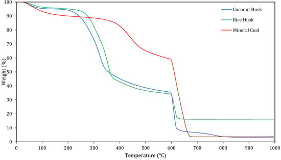 Between 200 °C and 400 °C, the biomasses experience a more pronounced weight loss, which corresponds to the thermal degradation of hemicellulose and cellulose releasing a large proportion of their volatile matter. This stage is more evident in coconut husk and rice husk than in mineral coal due to their higher volatile content.