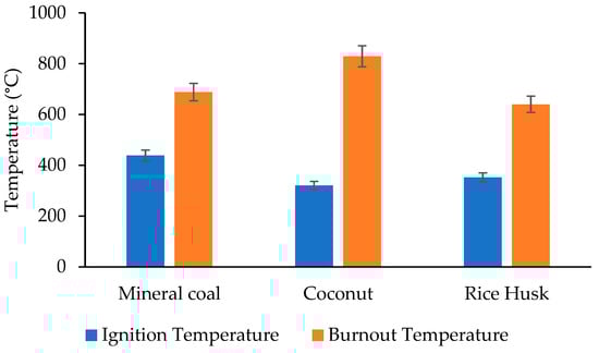 On the other hand, the TGA was used to determine the ignition temperature of each sample, which corresponds to the temperature at which a material begins to burn due to the onset of oxidation, identified by an abrupt change in the weight loss curve. Similarly, the burn-out temperature, which represents the point at which combustion is almost complete and the remaining mass loss is minimal, was determined for each type of biomass, as shown in Figure 4.