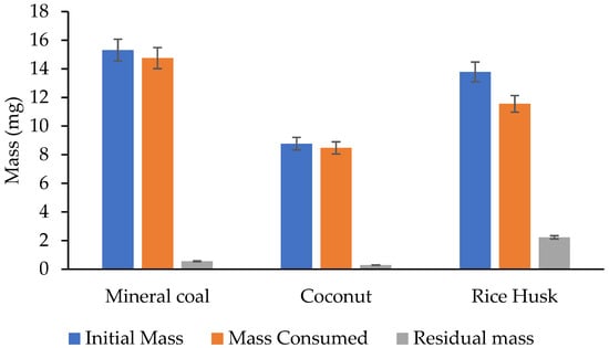 For this case, Mineral coal leaves a significant residue after decomposition (0.5573 mg), reflecting its high ash content. Coconut Husk has the lowest remaining residue (0.2902 mg), indicating more complete combustion and less ash. And Rice Husk leaves a considerable amount of residue (2.231 mg), which may be related to its silica content. This behaviour is consistent with Muthuraj et al., 2019, who note that the presence of silica in biomass can limit its combustibility by reducing the proportion of volatile organic matter and fixed carbon available for thermal reaction [].