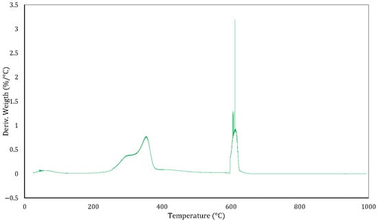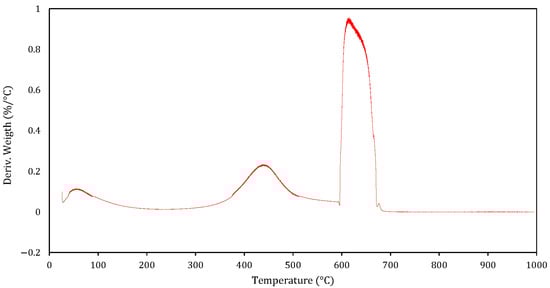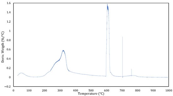 Figure 7 shows the DTG curve of mineral coal, representing the rate of weight change as a function of temperature. The test was conducted in an inert (N2) atmosphere from room temperature to 600 °C, followed by an oxidising (air) atmosphere from 600 °C to 1000 °C.