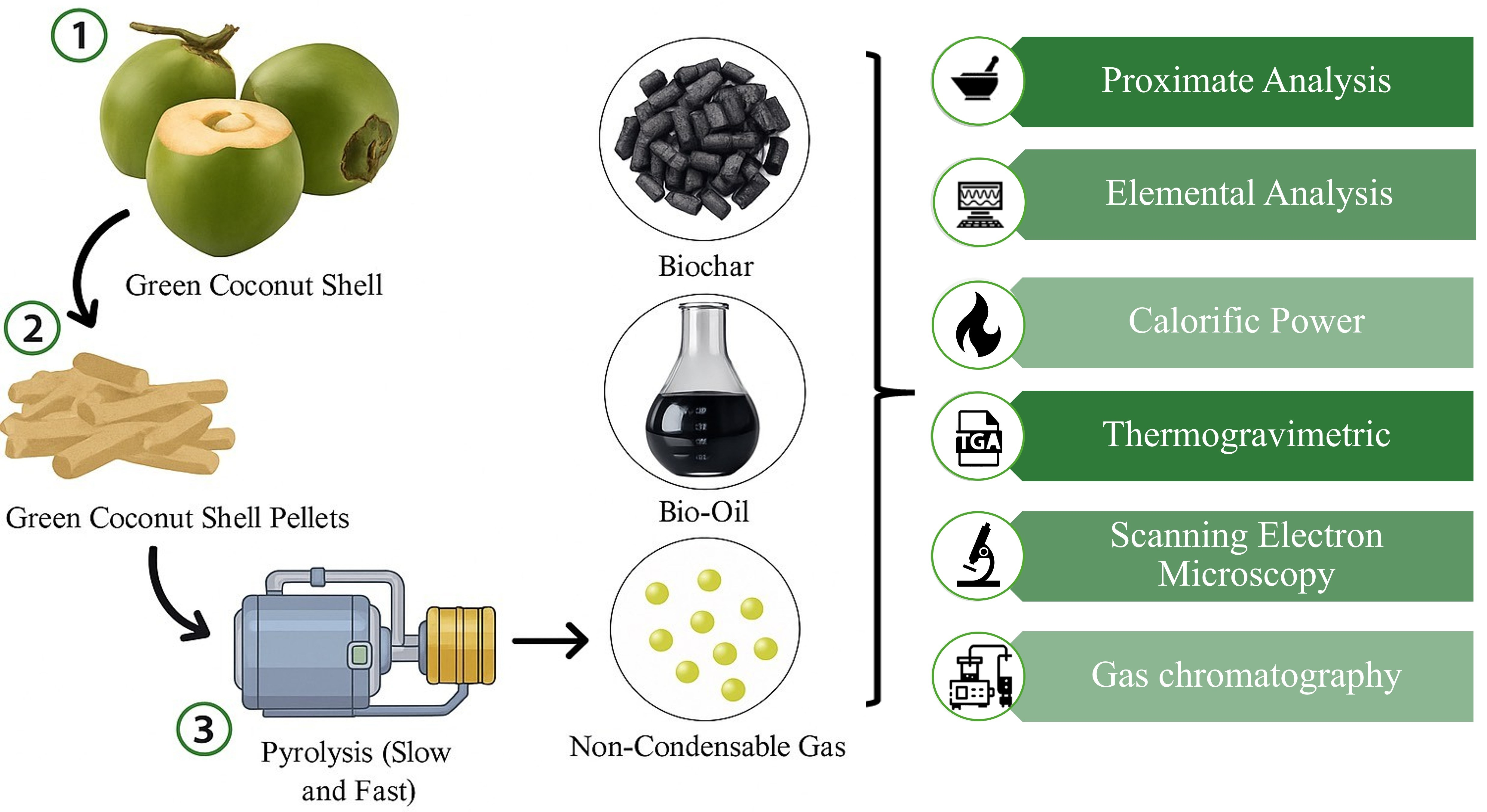 - Azeta, O.; Ayeni, A.O.; Agboola, O.; Elehinafe, F.B. A Review on the Sustainable Energy Generation from the Pyrolysis of Coconut Biomass. Sci. Afr. 2021, 13, e00909. [Google Scholar] [CrossRef]