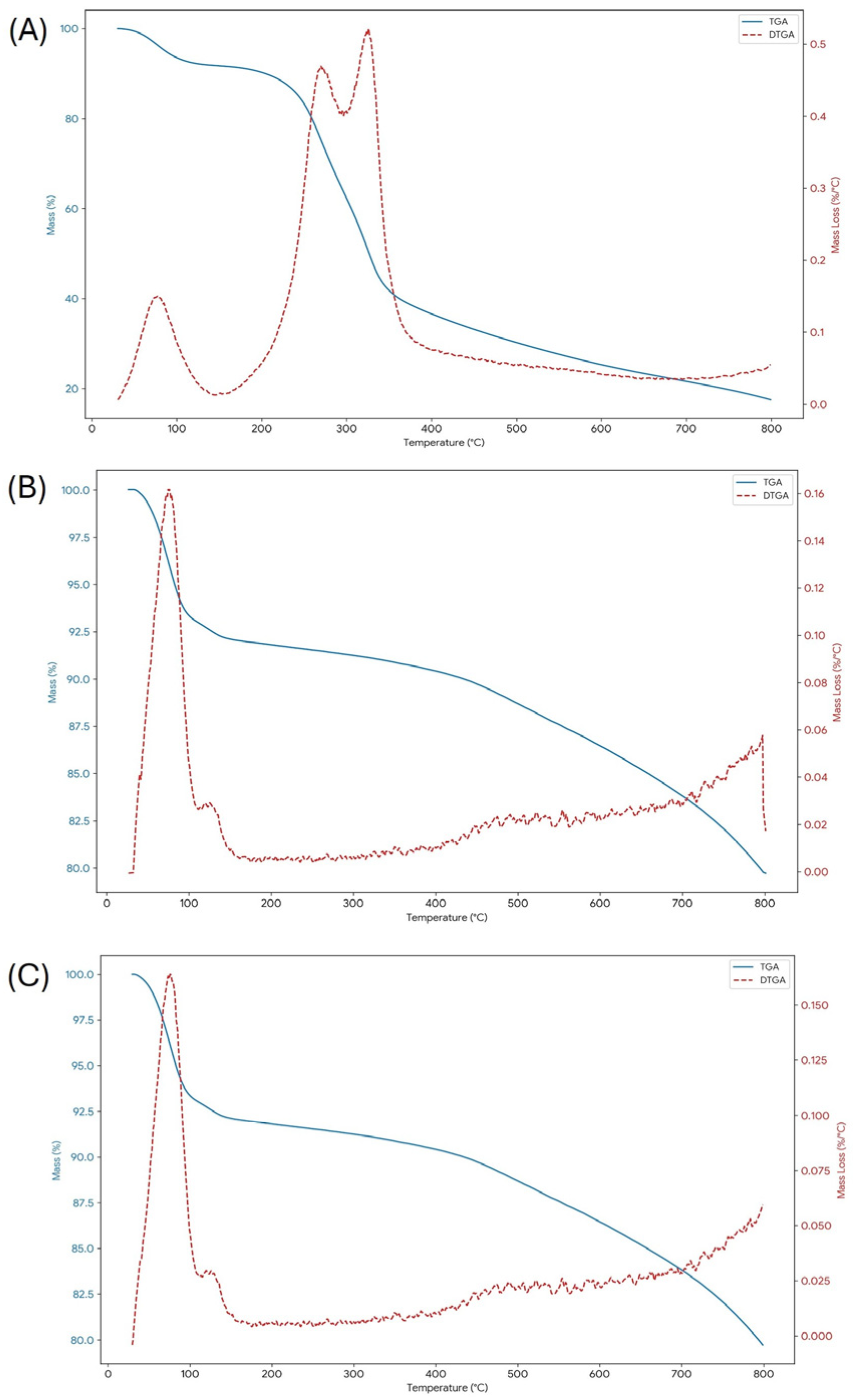 3.1.2. Thermal Stability Analysis (TGA/DTG)