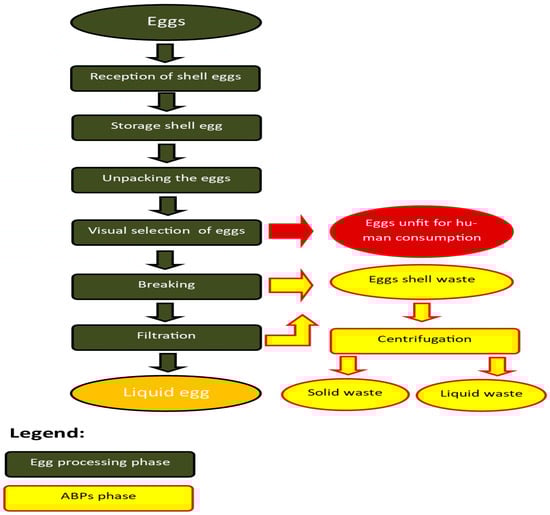 Egg by-products mainly include eggshells and membranes (solid by-products), liquid by-products from egg-breaking facilities, and eggs unfit for human consumption [25]. The production stage at which the by-product is generated is indicated in Figure 1.