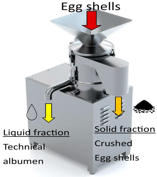 There are also some alternative methods for separating egg membranes from shells. Microwave treatment is based on the fact that membranes have a higher water content than shells and absorb more energy from electromagnetic waves, which leads to differential heating of the two components, followed by expansion of the membranes, weakening of the physical bonds between shells and membranes, and separation [79]. Another separation technique used industrially is the passage of eggshell fragments through a series of drills in an aqueous medium heated by steam, with the separation taking place in a cyclone [80].