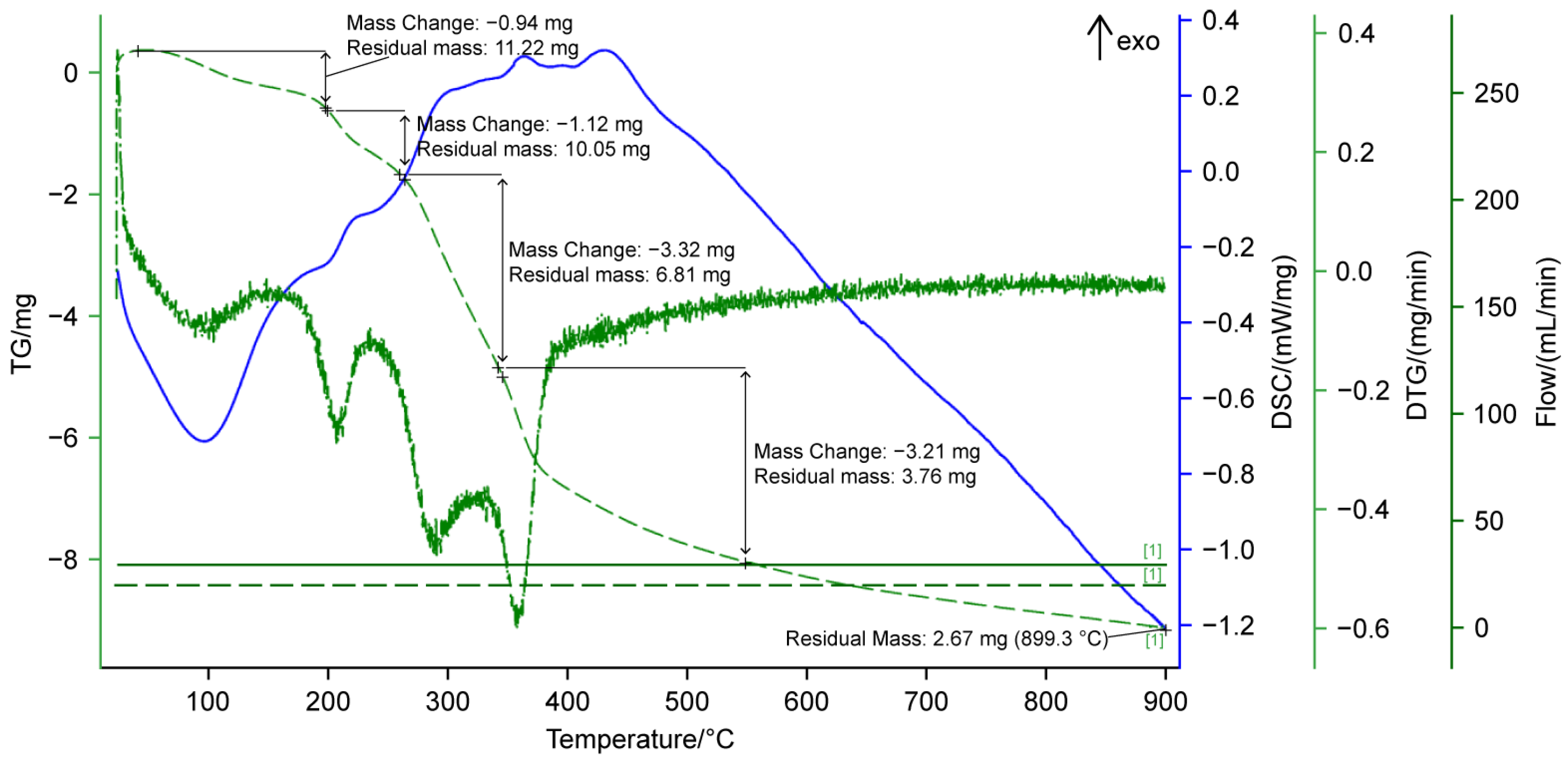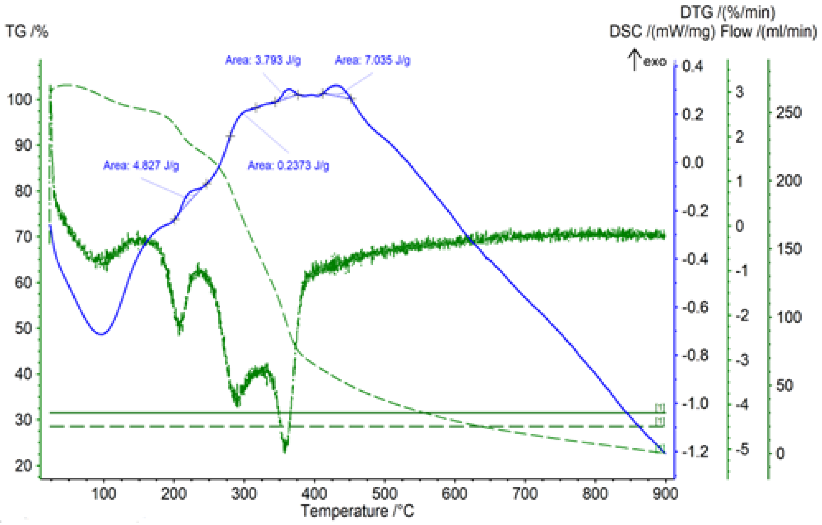 | Sample | Basic Mass Loss (°C) | Residue at 800 °C (wt.%) | Observed Exo/Endo Events | ∆H J/g |