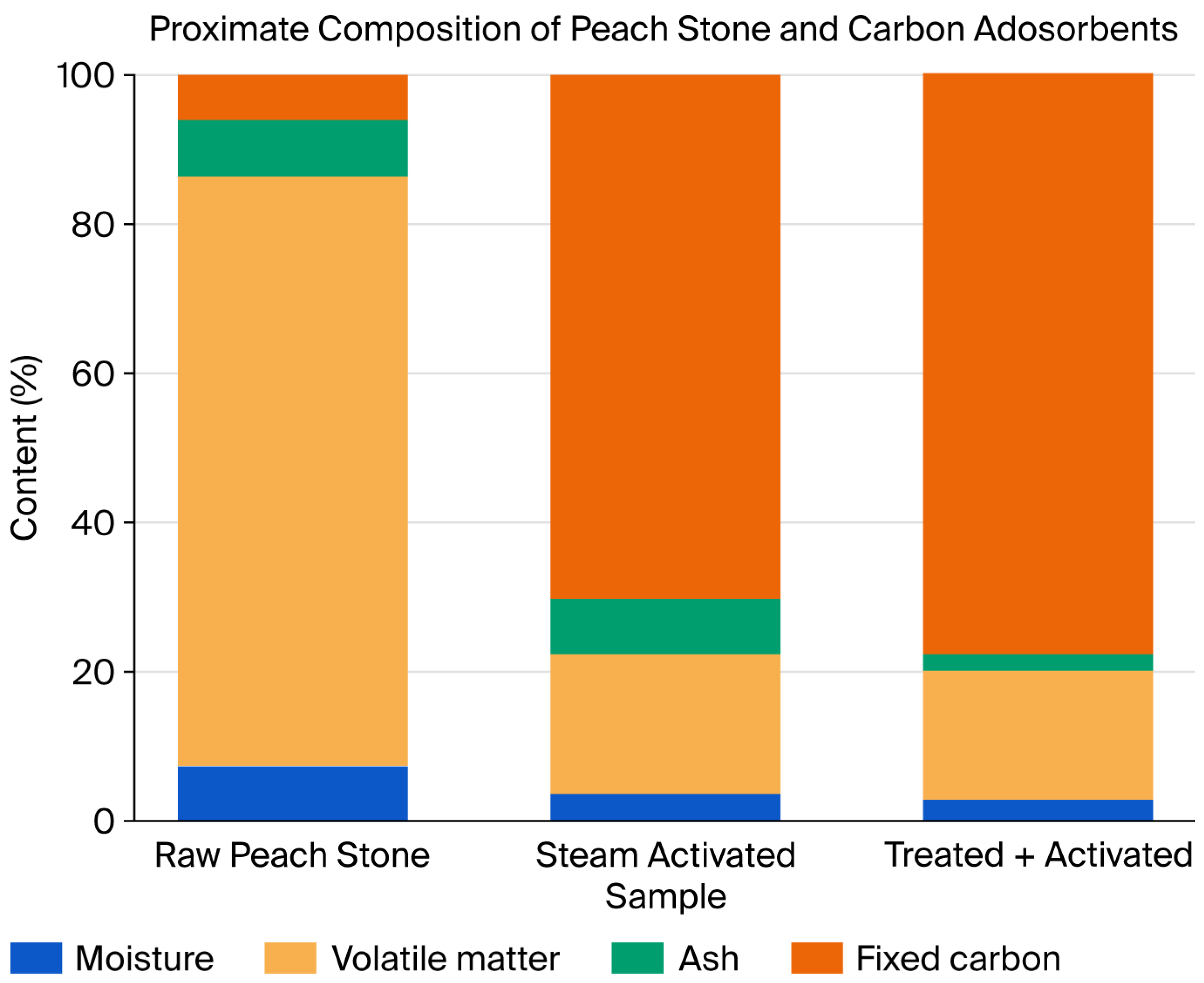 - Determination of the composition of the selected precursor. We focused on peach stones as a precursor, due to their high availability and favorable texture, for the use of physical activation for the preparation of carbon adsorbent.
