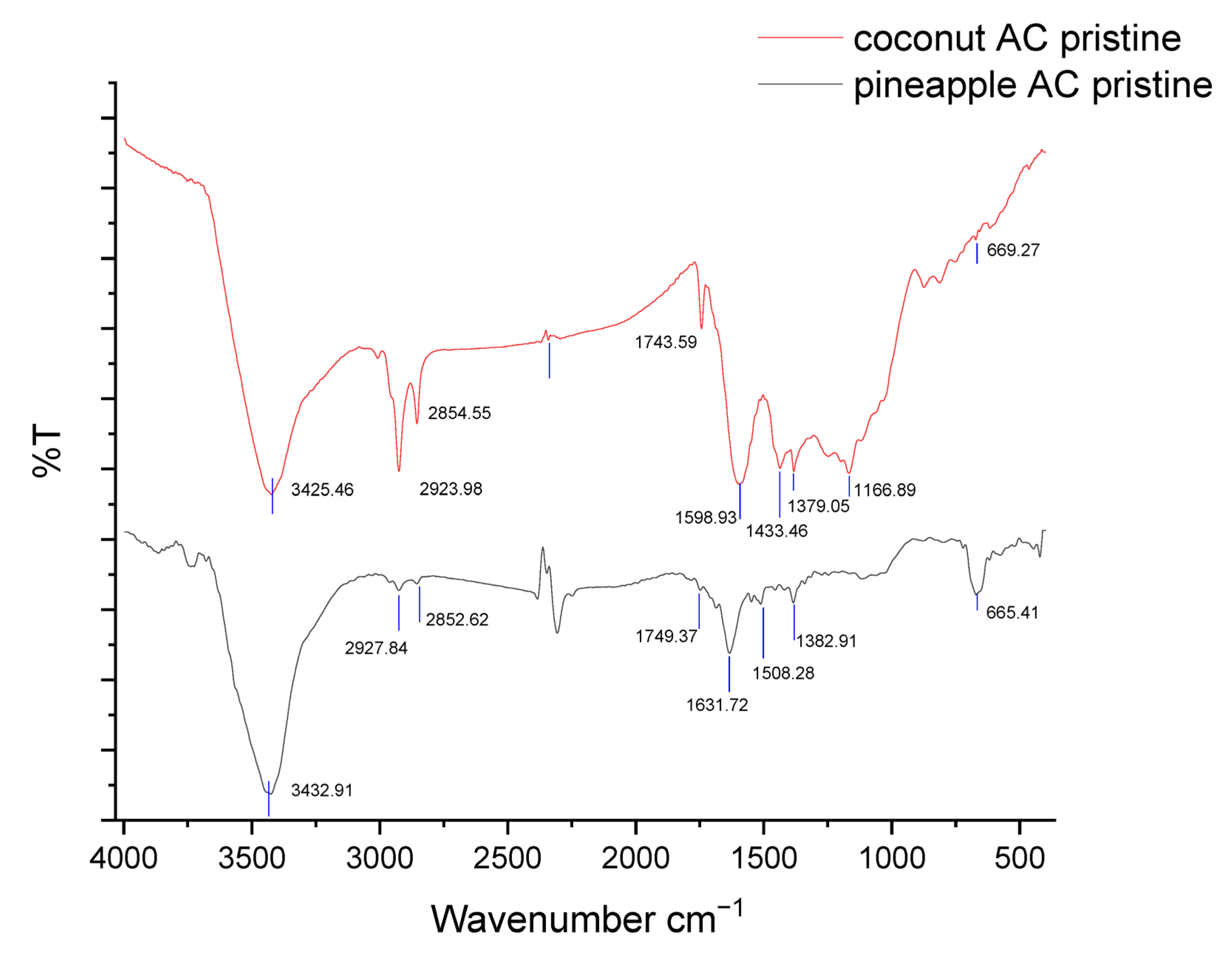 - Oni, B.A.; Abatan, O.G.; Busari, A.; Odunlami, O.; Nweke, C. Production and characterization of activated carbon from pineapple waste for treatment of kitchen wastewater. Desalination Water Treat. 2020, 183, 413–424. [Google Scholar] [CrossRef]