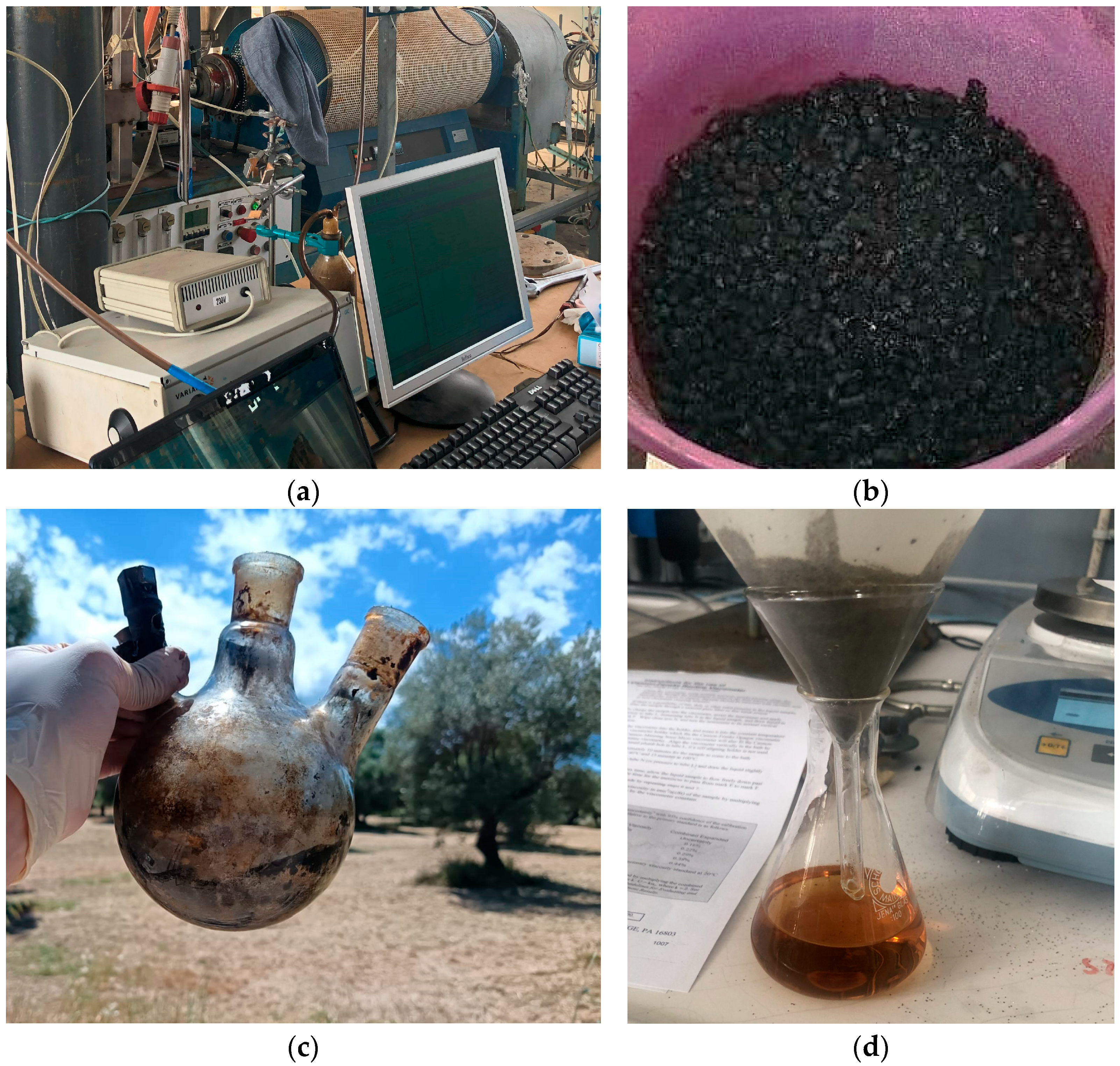 - Pedroza, M.M.; Sousa, J.F.; Vieira, G.E.G.; Bezerra, M.B.D. Characterization of the Products from the Pyrolysis of Sewage Sludge in 1 Kg/h Rotating Cylinder Reactor. J. Anal. Appl. Pyrolysis 2014, 105, 108–115. [Google Scholar] [CrossRef]