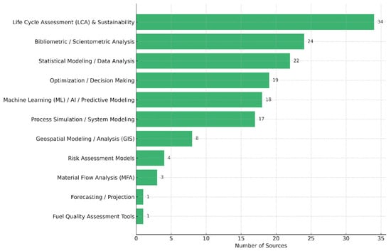 Complementary to lab-scale optimization, remote sensing technologies (e.g., SAR-based satellite imaging) [78] and Material Flow Analysis (MFA) [64,79] now inform large-scale residue availability and logistics. These spatially explicit assessments are further supported by Techno-Economic Analysis (TEA) [80,81] and discrete event simulation models [82], allowing researchers and decision makers to facilitate the modeling of supply chains, capital costs, and return on investment across various biomass valorization routes. Notably, conventional software platforms and mechanistic models continue to dominate large-scale residue quantification and logistics planning, while AI-driven methods are most often applied at localized or experimental scales where high-resolution datasets are available.