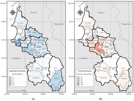 Spatial distribution of agricultural production density (t/km2) and livestock inventory density (animals/km2) in the Department of Sucre: (a) Agricultural production; (b) Livestock inventory. Source: own elaboration with data from: [8].