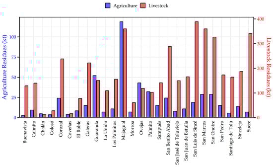 The municipal inventory, summarised in Figure 3, presents the total annual residue generation across the twenty-six municipalities. Majagual recorded the highest total biomass potential in the department, accumulating approximately 478.4 kt/year. This figure comprised 118.8 kt of agricultural residues—the maximum value observed for this category among all municipalities—and 359.6 kt of livestock residues. San Luis de Sincé and San Marcos followed as the subsequent largest producers, with total generation values of roughly 407.6 kt and 388.5 kt, respectively. In San Luis de Sincé, livestock waste constituted the predominant fraction (388.7 kt), whilst agricultural residues contributed 18.9 kt to the total mass.