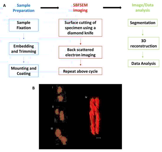 Principle of SBFSEM and a 3D model of a single chromosome. (A) Showing basic workflow of SBFSEM volume imaging; (B) different slices from an SBFSEM data stack showing segmentation (i–iii) and (iv) a 3D modelled X-shaped chromosome; scale bar—0.5 µM [].