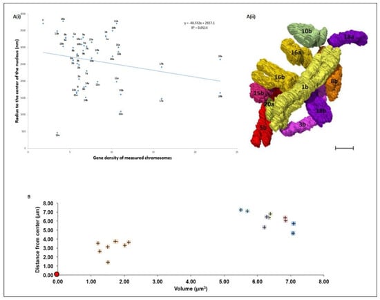 Spatial chromosome organization using SBFSEM. (A(i)) A 2D scatter diagram showing the radial organization of 46 chromosomes within a prophase nucleus. These chromosomes have a gene-density-based correlation with the radius of the nucleus. (A(ii)) A reconstructed 3D neighborhood cluster of prophase chromosomes (prepared from lymphocytes), showing 10 chromosomes that are in close proximity to chromosome 1 (1b) Scale bar—1 µm []. (B) A 2D scatter diagram showing the radial organization of largest (1–5) and smallest (19–22) metaphase chromosomes within an RPE cell. The chromosomes followed a volume-based correlation [].