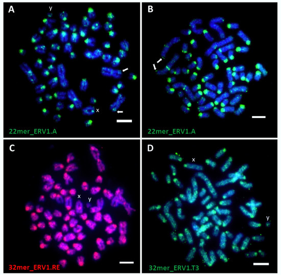 In situ hybridization of ERV1 probes (22 and 32 mer) from k-mers analysis to the male sheep metaphase chromosomes (2n = 54) (fluorescing blue with DAPI). (A,B). Probe 22mer_ERV1.A (green) labelled the centromeric regions of all acrocentric chromosomes. It showed small dots over the sex chromosomes X and Y (marked). Weak signals and very small dots were seen at centromeric and subtelomeric regions of submetacentrics (arrows). (C). Probe 32mer_ERV1.RE (magenta) was concentrated at centromeres with some additional dispersed signal. Notable signals were also seen on the X and Y chromosomes. (D). Probe 32mer_ERV1.T3 (green) showed centromeric and dispersed signal over all chromosomes Scale bar equals 5 µm.