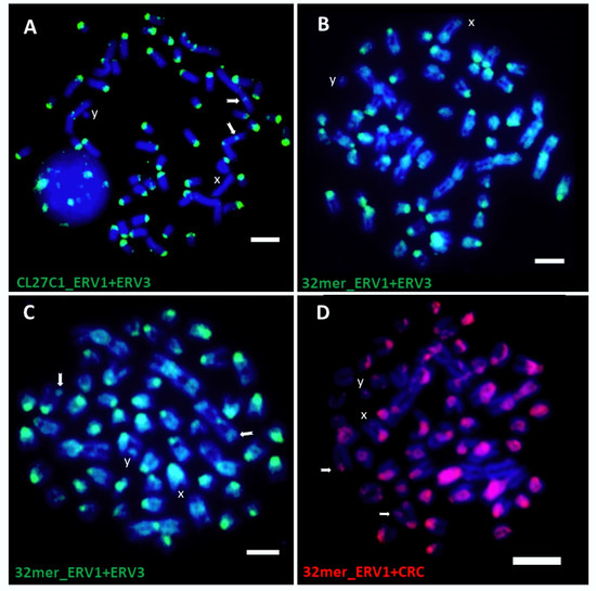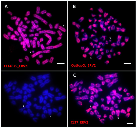 ERV3 sequences represented in the probe of CL67_ERV3 formed strong signals at centromeres of all acrocentric chromosomes, and one submetacentric pair, while the other two pairs of submetacentrics and the sex chromosomes had weaker signals (Figure 4). Consensus sequences of some clusters and k-mer contigs included similarity to both ERV1 and ERV3. The CL27C1_ERV1+ERV3 probe strongly hybridized to the centromeres of all acrocentrics, while centromeric and subtelomeric regions of some submetacentrics had weak signals. Sex chromosomes had no signals (Figure 5A). Similarly, probe 32mer_ERV1+ERV3 showed centromeric signals with some bands or broader sites along arms of chromosomes. Telomeric signals on some acrocentrics and submetacentrics were seen. Signals were also incorporated in X and Y chromosomes (Figure 5B,C).