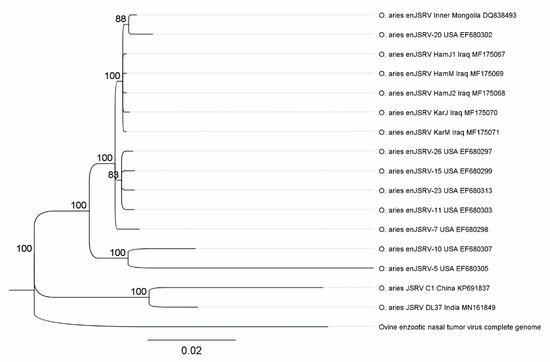 The five complete endogenous beta retroviruses (enJSRV) genomes of Iraqi sheep breeds were aligned with published enJSRV genomes (NCBI) from various sheep breeds worldwide. The phylogenetic status was identified by constructing Geneious Tree Builder within the Geneious Prime software. The parameters for the phylogenetic tree were set on Tamura-Nei as a genetic distance model, and Neighbor-Joining as a build method with 500 as a number of replicates. The complete genome of ovine enzootic nasal tumor virus (GU292314) was used as the out-group. Copy numbers, genomic proportions and coverage of ERV sequence (probe fragment) or the complete enJSRV genome were estimated by mapping the whole genome raw reads to the consensus (Table 2).