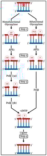 - Mullins, E.A.; Rodriguez, A.A.; Bradley, N.P.; Eichman, B.F. Emerging Roles of DNA Glycosylases and the Base Excision Repair Pathway. Trends Biochem. Sci. 2019, 44, 765–781. [Google Scholar] [CrossRef]