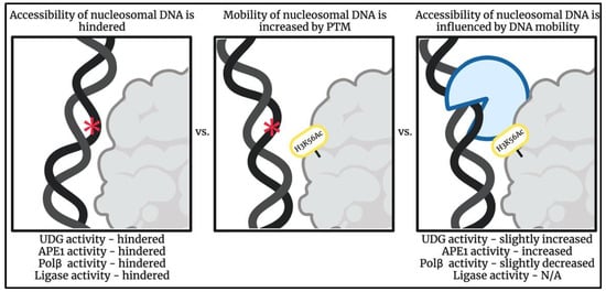 - Odell, I.D.; Wallace, S.S.; Pederson, D.S. Rules of engagement for base excision repair in chromatin. J. Cell. Physiol. 2013, 228, 258–266. [Google Scholar] [CrossRef] [PubMed]