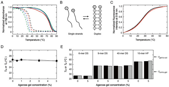 The porous matrix of agarose gels formed by hydrogen bonds is disrupted at high temperatures. The agarose used in this study exhibited a reversible thermal phase transition: the heating and cooling curves exhibited hysteresis loops with the gel–to–sol transition (Tgel-to-sol) temperature ranges of 60–85 °C and the sol-to-gel transition temperature (Tsol-to-gel) ranges of 20–40 °C, depending on the gel concentration (Figure 1A). Based on the phase transition temperatures, several oligonucleotides that formed a defined secondary structure were designed. Because the gel exhibits strong absorption in the UV region, the measurement of changes in the UV absorbance of oligonucleotides, which is a convenient method for measuring the thermal stability of DNA structures, was inapplicable. As a result, we measured changes in the fluorescence intensity during thermal melting and annealing of DNA structures bearing FAM as a fluorophore and Dabcyl as a quencher: the formation of base-pair structures decreases the fluorescence intensity of FAM due to quenching by Dabcyl at a short distance (Figure 1B). We verified that the agarose gel exhibited low absorption at the excitation and emission wavelengths of FAM.