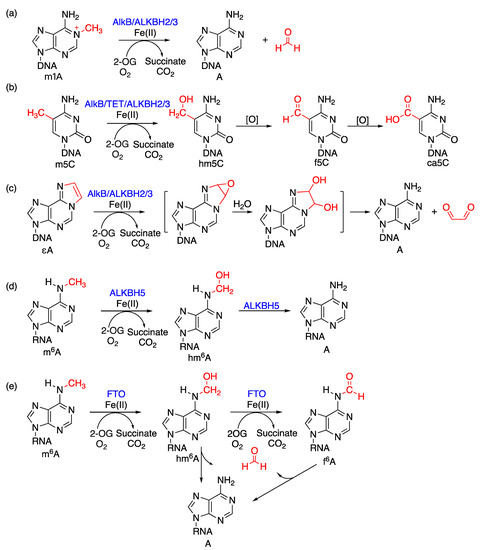 - Fedeles, B.I.; Singh, V.; Delaney, J.C.; Li, D.; Essigmann, J.M. The AlkB Family of Fe(II)/α-Ketoglutarate-Dependent Dioxygenases: Repairing Nucleic Acid Alkylation Damage and Beyond. J. Biol. Chem. 2015, 290, 20734–20742. [Google Scholar] [CrossRef]