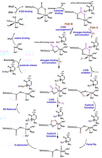 DNA and RNA are modified by exogenous and endogenous chemicals, such as methyl methanesulfonate (MMS) [1], dimethyl sulfate [2], acrolein, malondialdehyde [3], S-adenosylmethionine (SAM), and PUFA (polyunsaturated fatty acids), causing a variety of modifications [4,5,6]. Escherichia coli AlkB protein is one of the four proteins (Ada, AlkA, AlkB, and AidB) induced during the adaptive response to counteract the attack of alkylating agents [7,8,9,10]. AlkB was subsequently discovered as an Fe(II)/2-oxoglutarate (or α-ketoglutarate, 2-OG or α-KG)-dependent dioxygenase (Figure 1) [11,12,13,14]. This dioxygenase uses both oxygen atoms from O2 during the repair; one oxygen is utilized in the hydroxylated nucleic acid product and the other is used for the oxidation of the co-substrate 2-OG to succinate [15,16,17]. 2-OG-dependent dioxygenase was first discovered in 1967: Hutton et al. reported an oxygenase-dependent reaction catalyzed by collagen prolyl hydroxylase (CPH) that requires 2-OG [18]. Since this discovery, scientists have identified many 2-OG-dependent enzymes in the biological processes of plants and animals [19]. The TET/JBP family also belongs to the 2-OG oxygenases. The AlkB, TET and JBP family enzymes have been studied extensively for their DNA/RNA modification activities. The overall reaction mechanism of the AlkB/TET enzymes follows the general strategy of non-heme Fe(II)/2-OG enzymes that includes 2-OG binding and DNA/RNA substrate binding, followed by dioxygen binding and activation, hydrogen atom transfer, rebound hydroxylation and product release (Figure 2) [20].