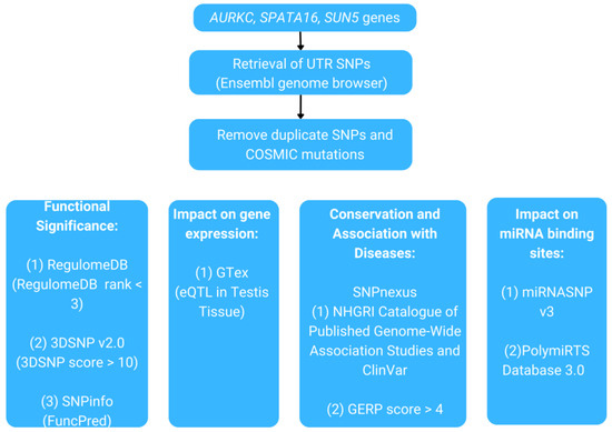 The Ensembl genome browser (GRCh38/hg38) [48] was employed to retrieve SNPs located in the 3′ and 5′ UTRs of the AURKC, SPATA16, and SUN5 genes. Duplicate variants and somatic mutations associated with cancer, according to the COSMIC database [49], were excluded, resulting in a final list of SNPs. These SNPs then underwent a thorough multi-step filtering process using various databases and in silico tools, as detailed in the subsequent sections and summarized in Figure 1.