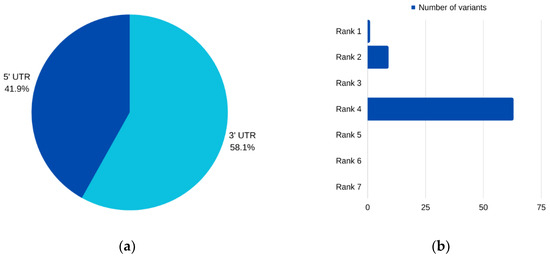 We initially retrieved 175 UTR variants from the Ensembl genome browser [46]. Following the elimination of duplicate variants and the exclusion of somatic mutations associated with cancer, a total of 74 variants remained for further analysis. Among these, 31 variants were located in the 5′ UTR and 43 were in the 3′ UTR (see Figure 5a and Table S11).