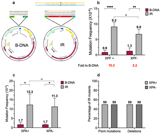 Short IR-induced mutagenesis decreases in the absence of ERCC1-XPF and remains unchanged in the presence or absence of XPA. (a) Schematic of the control (B-DNA) and 29-bp GC-rich (IR) plasmids used in this study. The supF-containing pSupFG1 vector was used as a control reporter ((B-DNA) and a 29-bp IR sequence capable of forming a cruciform DNA structure (IR) was cloned into the supF-containing reporter vector, pSP189, using standard cloning protocols. There are two stretches of IRs (14-bp long) that form the stem of the cruciform structure (regions in blue and yellow) and a loop that consists of a single nucleotide (highlighted in black). (b) Mutation frequencies were measured in human XPF-proficient fibroblast cell lines in the presence of control siRNA. Mutation reporters containing control (B-DNA) sequences or short, perfect inverted repeat (IR) sequences were transfected into the human XPF-proficient cells at T48 and collected 48 h later at T96. Mutation frequencies were calculated as the ratio of white colonies to the total number of colonies. Experiments were performed in triplicate, data are expressed as mean ± SD, and a 2-way ANOVA with Šidák post hoc test, * p < 0.05, ** p < 0.01, **** p < 0.0001 was used for statistical analysis. (c) Mutation frequencies were measured in human XPA-proficient and deficient cell lines. Mutation reporters containing control (B-DNA) sequences or short inverted repeat (IR) sequences were transfected into the cells and isolated 48 h post-transfection. Mutation frequencies were calculated as the ratio of white (mutant) colonies to the total number of colonies (blue plus white). Experiments were performed in triplicate. Data are expressed as mean ± SD, and a 2-way ANOVA with Šidák posthoc test, * p < 0.05, was used for statistical analysis. (d) Percentage distribution of different types of mutants. Mutants are characterized as point mutations and deletions. Gray solid bars represent samples from XPA-proficient cells, and gray patterned bars represent samples from XPA-proficient cells. (Adapted from [45]).