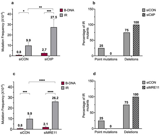 Short IR-induced mutagenesis increases in the absence of CtIP and MRE11. (a) Mutation frequencies were measured in human XPF-proficient cell lines in the presence of siCON or siCtIP. Mutation reporters containing control (B-DNA) sequences or short inverted repeat (IR) sequences were transfected into the human XPF-proficient cells at T48, being collected 48 h later at T96. Mutation frequencies were calculated as the ratio of white colonies to the total number of colonies. Experiments were performed in triplicate, data are expressed as mean ± SD, and a 2-way ANOVA with Šidák post hoc test, * p < 0.05, ** p < 0.01, *** p < 0.001 was used for statistical analysis. (b) Percentage distribution of different types of mutants in human XPF-proficient cells following treatment with siCON or siCtIP. Mutants are characterized as point mutations and deletions. Gray solid bars represent siCON-treated samples and gray patterned bars represent siCtIP-treated samples. (c) Mutation frequencies were measured in human XPF-proficient cell lines in the presence of siCON or siMRE11. Mutation reporters containing control (B-DNA) sequences or short inverted repeat (IR) sequences were transfected into the human XPF-proficient cells at T48 and collected 48 h later at T96. Mutation frequencies were calculated as the ratio of white colonies to the total number of colonies. Experiments were performed in triplicate, data are expressed as mean ± SD and a 2-way ANOVA with Šidák post hoc test, *** p < 0.001, **** p < 0.0001 was used for statistical analysis. (d) Percentage distribution of different types of mutants in human XPF-proficient cells following treatment with siCON or siMRE11. Mutants are characterized as point mutations and deletions. Gray solid bars represent siCON-treated samples, and gray patterned bars represent siMRE11-treated samples. (Adapted from [45]).