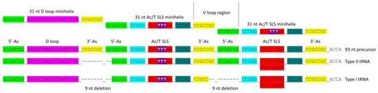 The purpose of this review is to integrate an understanding of type II tRNA variable (V) loops into an appreciation of tRNA evolution, tRNAome diversification, aminoacyl-tRNA synthetase (AARS) divergence, and genetic code evolution. Type I and type II tRNAs were generated from defined sequences in pre-life (Figure 1). The 93 nt tRNA precursor was generated from the ligation of three 31 nt minihelices with two distinct 17 nt cores [1]. A D loop 31 nt minihelix was ligated to two anticodon/T stem–loop–stem minihelices. A D loop minihelix also forms a stem–loop–stem, but one that is not preserved in the tRNA fold. The 31 nt minihelices were part of a more ancient translation system that attached 3′-ACCA-Gly to synthesize polyglycine, a component of protocells. During pre-life, RNAs were ligated (i.e., by a ribozyme ligase), replicated, and processed to generate, for instance, 31 nt minihelices or, sometimes, more complex molecules such as type I and type II tRNAs. As shown in Figure 1, type II tRNAs were generated from a 93 nt tRNA precursor molecule by a single internal 9 nt deletion, within ligated 3′- and 5′-acceptor stems (93 nt neglects 3′-ACCA; a primitive adapter molecule). Type I tRNAs were generated by two closely related internal 9 nt deletions. The more 5′- 9 nt deletion was identical for type I and type II tRNAs. The more 3′- 9 nt deletion, unique to type I tRNAs, was within the V loop region. Please note that the 5′- and 3′- 9 nt deletions are identical on complementary strands. Longer type II V loops, therefore, are not an expansion from a shorter type I V loop. Rather, in the evolution of the first tRNAs, type I V loops resulted from processing of a type II V loop. The processing event within the V loop region to convert a type II tRNA into a type I tRNA was a single 9 nt internal deletion within ligated 3′- and 5′-acceptor stems.