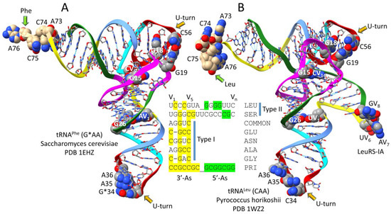 Figure 3A shows archaeal Pyrococcus horikoshii tRNALeu (CAA) in the aminoacylating “hairpin” conformation [24,28]. Structures of tRNAs are from co-crystal structures with cognate AARS. “Hairpin” relates to the bent-down 3′-end of the tRNALeu into the LeuRS-IA aminoacylating active site. V loops are numbered V1-Vn for a V loop of n bases. For historical reasons, standard numbering of tRNAs breaks down in the D loop and V loop, explaining why we use the V1 to Vn numbering here. P. horikoshii (an ancient Archaeon) tRNALeu (CAA) has a V loop of 14 nt, which is the primordial (pre-life) length [1,2,3]. UV1 interacts with tRNA-G26 (UV1~G26). V2-CCC-V4 is the V arm 5′-stem. V5-GUAG-V8 is the V arm end loop. V arm end loop bases V6-UAG-V8 are highly conserved in Archaea and bind to archaeal LeuRS-IA, as indicated (see below). V9-GGG-V11 forms the V arm 3′-stem. V12-UU-V13 are two unpaired bases, just 5′ of the Levitt base (CV14). The Levitt base (CV14) forms a reverse Watson–Crick base pair with tRNA-G15 (CV14 = G15) (the Levitt base pair). The number of unpaired bases just 5′ of the Levitt base Vn determines the trajectory of the V arm from the tRNA body.