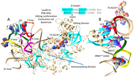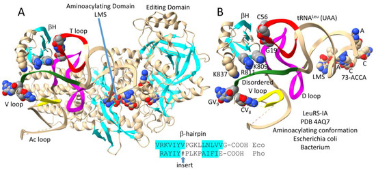 Figure 4A shows the archaeal LeuRS-IA-tRNALeu (CAA) structure in the aminoacylating conformation. LeuRS-IA has separate aminoacylating and editing/proofreading active sites. The tRNALeu (CAA) 3′-end is in the hairpin conformation for aminoacylation. Because LeuRS-IA is a class I AARS, the aminoacylating active site is also identified by parallel β-sheets. Figure 4B shows a C-terminal fragment of LeuRS-IA interacting with the tRNALeu V arm. In Archaea, the highly conserved V arm end loop sequence V6-UAG-V8 interacts with the C-terminal LeuRS-IA β-hairpin. In Pyrococcus horikoshii but not in Bacteria, the β-hairpin has an ~93-amino-acid insert that interacts with the tRNALeu elbow, where the D loop and T loop interact (i.e., where tRNA-G19 pairs with tRNA-C56 (a bent Watson–Crick pair)). The length of the insert in the archaeal C-terminal LeuRS-IA β-hairpin depends on how sequences are aligned. The V loop is 14 nt, which is the primordial (pre-life) length [1,2,3]. More detail about the tRNALeu (CAA) V loop is shown in Figure 3A. The comparison of an archaeal editing/proofreading LeuRS-IA-tRNALeu structure would enrich this discussion.