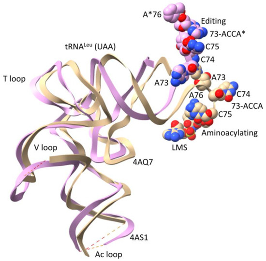 Overlay of LeuRS-IA-tRNALeu (UAA) co-crystal structures indicates allosteric communication linking the tRNALeu 3′-end and the type II V arm 3′-stem [30]. The beige tRNALeu is in the aminoacylating hairpin conformation, with an unstructured V arm end loop (see Figure 5). LMS is a non-reactive leucine–AMP reaction intermediate analog bound in the aminoacylating active site. The pink tRNALeu is in the editing/proofreading conformation, with a structured V arm end loop (see Figure 6). A*76 indicates a modified 3′-A* that directed the tRNALeu 3′-end into the editing/proofreading active site.