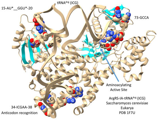 This section is included for completeness and to tie the analysis of type II tRNAs into the formation of 6-codon genetic code sectors. Leucine, serine, and arginine probably entered the genetic code at about the same time and occupied 6-codon sectors [5,6,7]. In contrast to LeuRS-IA and SerRS-IIA, ArgRS-IA utilizes a type I tRNA and, also, anticodon recognition for tRNAArg (Figure 10). Because ArgRS-IA utilizes five tRNAArg anticodons from two genetic code rows (2 and 3), there is potential ambiguity in reading the anticodon sequence. The structure shown is a yeast ArgRS-IA-tRNAArg (ICG) (I for inosine). Inosine is formed by the deamination of adenine. In Archaea, wobble tRNA-34A is not utilized. Notably, when A is modified to I in Bacteria and Eukarya, the corresponding G anticodon (i.e., GCG) is not utilized. Because tRNA-34I reads mRNA wobble A, C, and U, wobble inosine can only be utilized in a 3- or 4-codon sector [35,36]. The structure in Figure 10 has tRNAArg (ICG) in the hairpin conformation with the tRNAArg 73-GCCA bending down into the aminoacylating active site, which is also identified by parallel β-sheets and arginine binding. The anticodon loop has the sequence 34-ICGAA-38 [37]. Because of ambiguities in tRNAArg anticodon reading, the anticodon loop is substantially unwound, exposing tRNA-38A to interact with ArgRS-IA. Because of anticodon ambiguity, the strongest sequence-specific contacts are expected for tRNA-35C and tRNA-38A. Substantial unwinding of the anticodon loop is expected to generate torque on the tRNAArg 3′-end to support the aminoacylating conformation.