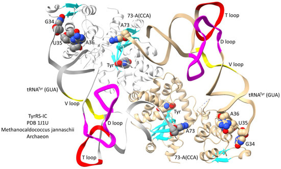 Interestingly, tRNATyr is a type I tRNA in Archaea and a type II tRNA with a longer V arm in Bacteria [38]. An archaeal TyrRS-IC-tRNATyr co-crystal is shown in Figure 11. In contrast to most other class I AARSs, which are monomers, class IC AARSs are obligate α2-dimers with anticodon-binding domains and aminoacylating domains in opposite subunits. Via TyrRS-IC protein, the anticodon-interaction domain is only loosely connected to the aminoacylating domain, indicating that allosteric contacts at the anticodon-binding region may be communicated to the aminoacylating active site mostly via the tRNA. Because the tRNATyr (GUA) 3′-end is disordered (only A73 of 73-ACCA is ordered), the structure is not in a fully aminoacylating conformation. The aminoacylating active site is indicated by binding of tyrosine and parallel β-sheets.