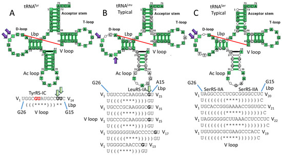 Type II V loops in Thermus thermophilus (typical tDNA sequences are shown) [13]. (A) tRNATyr; (B) tRNALeu; and (C) tRNASer. Lbp indicates the Levitt base pair. Deleted bases in the D loop are indicated with purple arrows. Green arrows indicate unpaired bases just 5′ of the Levitt base that determine the trajectory set point of the V arm from the tRNA body (Figure 3). Notations are consistent with other figures. TyrRS-IC binds the V arm 5′-stem and V arm end loop bases V5-GU-V6 (red; see Figure 12). LeuRS-IA binds the V arm 3′-stem but not the end loop (Figure 5 and Figure 6). SerRS-IIA binds the elbow and the V arm 5′- and 3′-stems (Figure 8 and Figure 9).