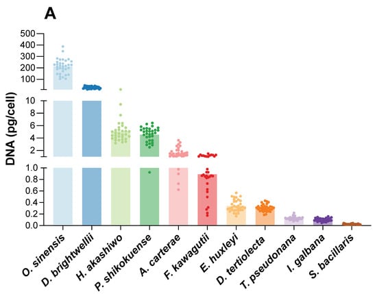 - Gonzalez-de-Salceda, L.; Garcia-Pichel, F. The allometry of cellular DNA and ribosomal gene content among microbes and its use for the assessment of microbiome community structure. Microbiome 2021, 9, 173. [Google Scholar] [CrossRef] [PubMed]