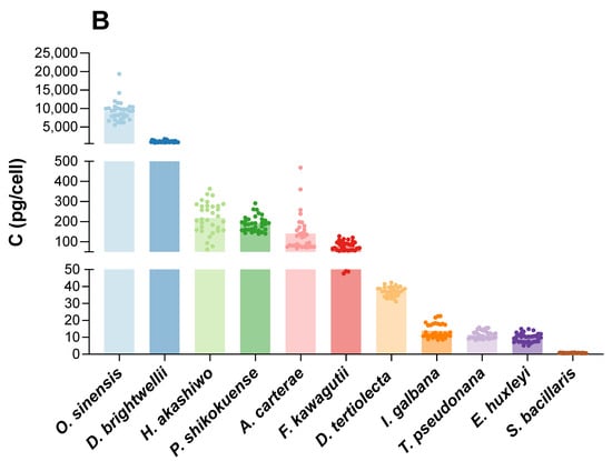 Information of carbon (C) content from living organisms is critical for studying biogeochemical cycles of carbon but not easy to obtain. For instance, C biomass estimation for natural marine phytoplankton at community, class, or species levels is very important in biological oceanographic research; it is essential for balancing the C budget and for assessing the contribution of each species or class in the community to primary production, biogeochemical processes, and carbon export in the ocean [1,2]. The information of C biomass may not be accurately represented by cell abundance as contributing species being compared are likely to have different cell sizes. However, while community C biomass is tedious to measure, it is practically impossible to measure C for individual species or groups of species in a natural community. Indirect methods exist, e.g., based on cell size versus carbon content correlations, such that the C content of a cell can be estimated from cell size; then, the carbon biomass of a population can be estimated from cell abundance multiplied by the inferred C content. Indeed, several such regression equations have been developed separately for different functional groups of plankton (protists) [1,3,4,5,6]. This method has proven very useful and remains the only available method, yet it is time-consuming and requires extensive technical expertise in taxonomy if the cell size-based carbon biomass information were to be attributed to species. Furthermore, the method is not applicable to species that are unable to be cultured and are only identified from the rapidly growing body of environmental DNA (eDNA) data and hence no cell size data are available (e.g., TARA Oceans). Often, researchers are forced to use conversion constants for functional or size groups of phytoplankton to convert cell abundance to carbon biomass [2].
