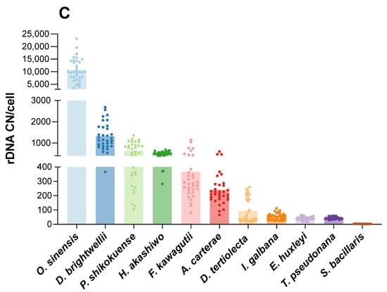 qPCR was carried out for all cultures to estimate the rDNA copy number per cell. Species-specific primers were used throughout this study for each species, for both eukaryotes (18S) and prokaryotes (16S), as shown in Table S1. Standards were prepared by amplifying a ~1.5 kbp rDNA region from the target species, quantifying it, and making 10-fold serial dilutions [44]. Efficiencies and R2 were used to evaluate the quality of qPCR and accuracy, with PCR efficiency > 80% and R2 > 0.998 as minimal criteria. Melt curves were generated to check the specificity of the amplification. Technical details were as reported in Yuan et al. [40] and Saad et al. [27]. The rDNA copy number per cell was estimated by multiplying the copy number per nanogram of genomic DNA measured from qPCR by genome size. The documented rDNA copy numbers from the sequenced genomes were used, where applicable, to check accuracy.