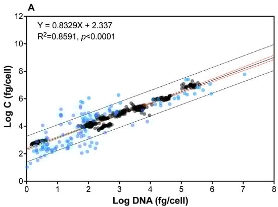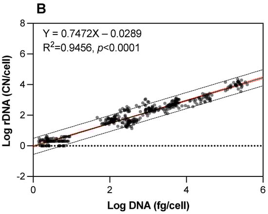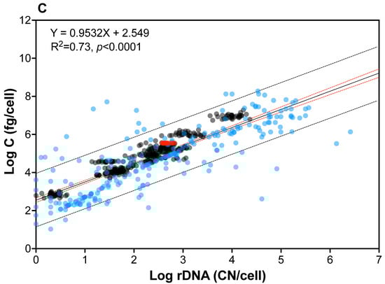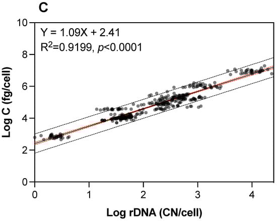 Log-log correlations of C content vs. DNA content (A), rDNA copy number vs. DNA content (B), and C content vs. rDNA copy number (C) for 11 phytoplankton species across different growth stages, P levels, and temperatures. Data of 80 cyanobacteria species from a previous study were included in (B) [49,50]. The solid line is the regression line, the red dashed line depicts the 95% confidence interval, the black dashed line denotes the 95% prediction interval, and the black dotted line is the zero baseline in (B).
