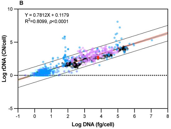 Beyond microbes, we further collected data from multi-cellular organisms, including plants and animals. Prokopowich et al. [26] reported DNA content and rDNA copy numbers for 94 species of animals and 68 species of plants, and found a log-log linear correlation (LogDNA = 0.6352 LogrDNA + 1.576, R = 0.3536, p < 0.0001). Additionally, the C content, DNA content, and rDNA copy number for humans were also collected [45,46,47,48,59]. Notably, variations in the rDNA copy number were observed within humans, with potential causes including cancer-induced rDNA loss due to DNA damage, replication stress, and alterations associated with DNA methylation. These changes are linked to factors such as aging, body mass, schizophrenia, and lifespan, paralleling the influences of growth stages or culture age in phytoplankton. Given rDNA’s critical role in maintaining life, adaptation, and evolution, further research is essential [59,73,74,75,76,77,78,79]. When we incorporated these new data into our correlation figures, they revealed similar trends. In particular, the human data exhibited a remarkable fit with all the correlations (Figure 3). This result suggests the correlations among the three parameters potentially hold for a broader range of organisms.