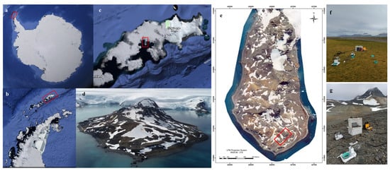 Soil sample collection locations on the Keller Peninsula, King George Island. (a) The South Shetland Islands, Maritime Antarctic; (b) King George Island; (c) Keller Peninsula in Admiralty Bay; (d) oblique aerial photograph of Keller Peninsula; (e) paraglacial region (red rectangle) at Keller Peninsula where the samples were obtained (62°5′23.695″ S; 58°24′24.162″ W); (f) vegetated soil; and (g) non-vegetated soil. Photo d by L. H. Rosa; photos e and g M.R. Francelino.