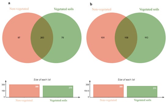 Venn diagrams showing the distribution of (a) prokaryotic and (b) eukaryotic assemblages across the non-vegetated and vegetated soil samples obtained on Keller Peninsula, King George Island.