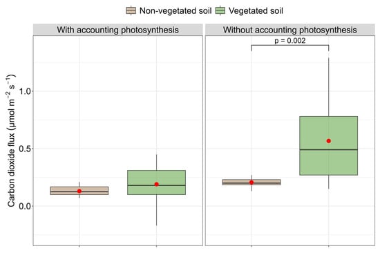 Measured values of carbon dioxide fluxes for non-vegetated soil and vegetated soil.