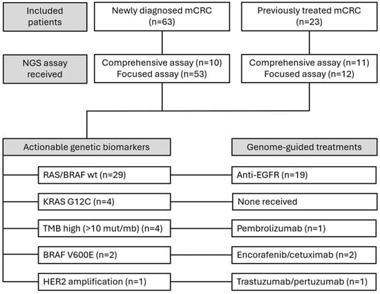 A total of 86 patients were included, 66.3% of whom were male. Of these, 57% had colon cancer and 43% had rectal cancer, with the majority presenting with left-sided disease (83.7%). Sequencing was performed predominantly at the time of metastatic disease diagnosis (73.3%), utilising biological material from the primary tumour (74.4%) and a focused NGS assay (75.6%). Among the 23 patients who underwent NGS for previously treated mCRC, 6 were not re-biopsied, with sequencing performed on primary tumour samples. Table 1 provides baseline characteristics according to the sequencing assay performed.
