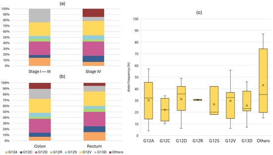 Relative frequencies of each KRAS variant according to stage at diagnosis (a) or location of the primary tumour (b). Graphic (c) displays a box plot showing the distribution of the median allele frequency for each KRAS variant.